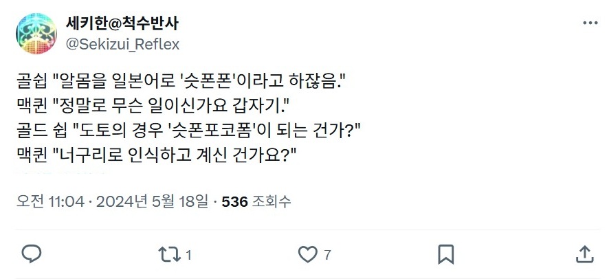 | - せきはん@脊髄反射, 2024년 05월 18일 게재 - 출처: https://x.com/Sekizui_Reflex/status/1791651112728322170 |