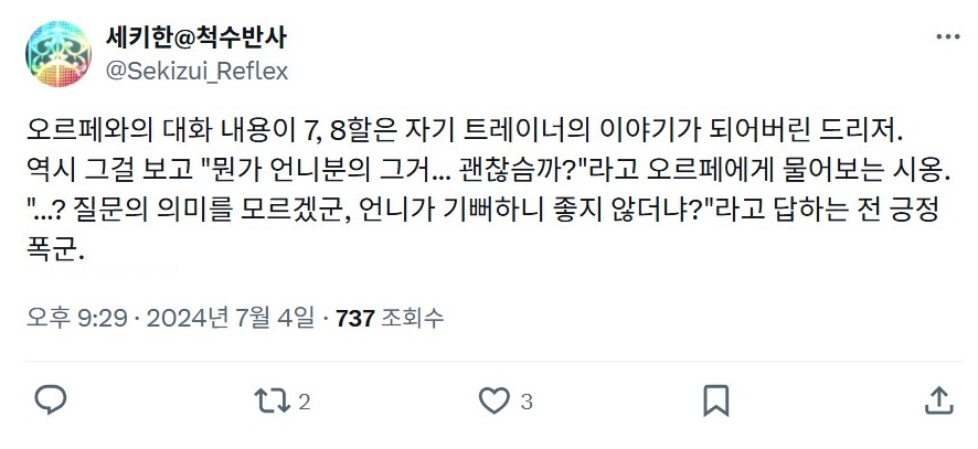 | - せきはん@脊髄反射, 2024년 07월 04일 게재 - 출처: https://x.com/Sekizui_Reflex/status/1808840461668528150 |