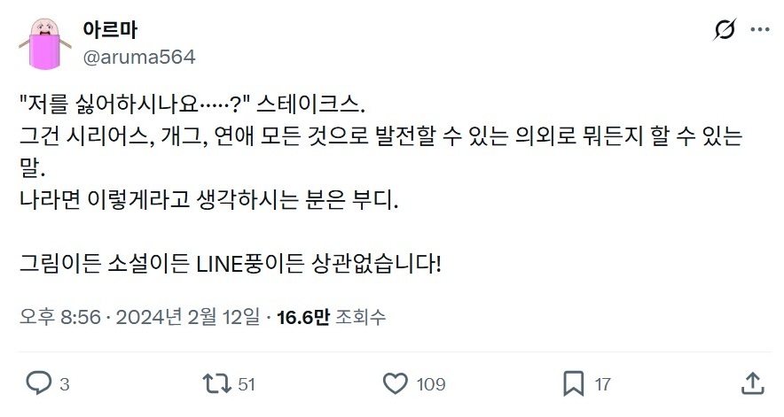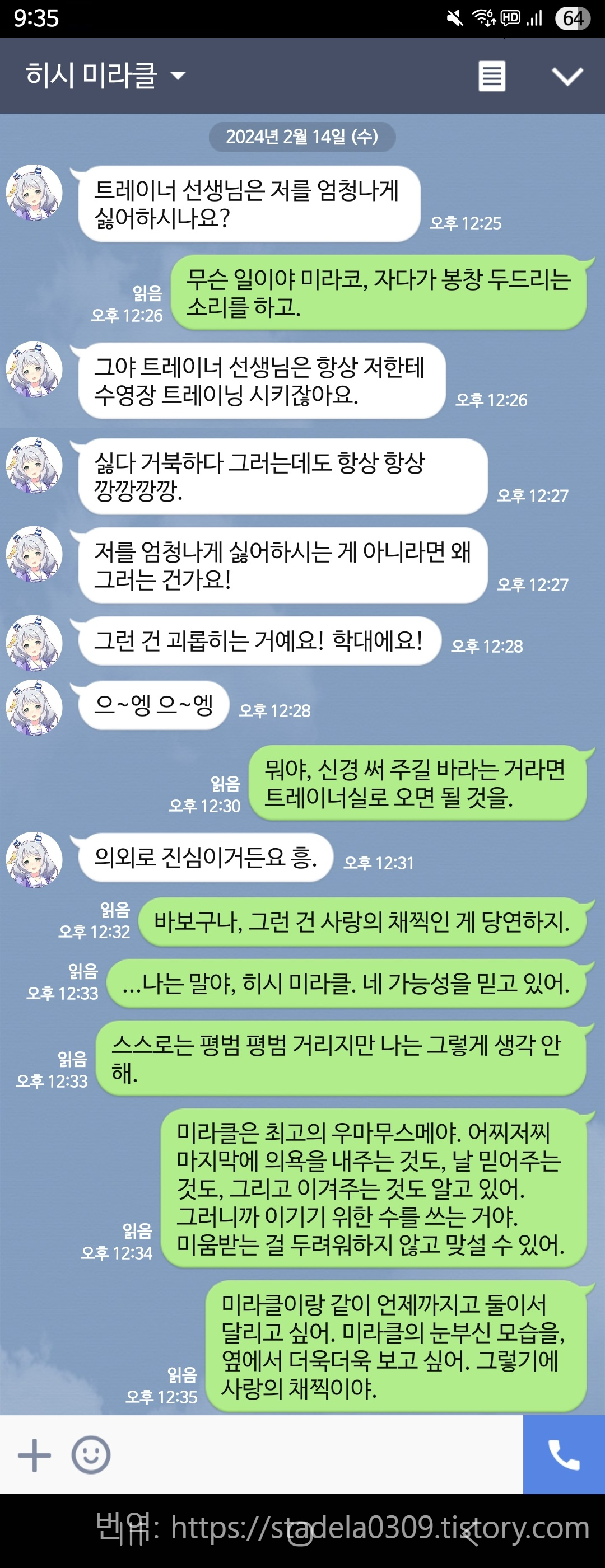 | 【우마무스메 LINE풍】 하이드라의 장난감 상자입니다. 아르마 씨의 스테이크스에 참가하게 되었습니다. 제 안의 미라코는 금방 우쭐해지는 여동생 같은 이미지란 말이죠... 그러니 실제와 다른 부분이 있을지도 모르지만, 부디 양해해 주시길. 그러면 부디 "공략하기 쉬운 미라코" - ハイドラの玩具箱, 2025년 02월 15일 게재 - 출처: https://x.com/hydelanderbox/status/1757920655511805960 |
