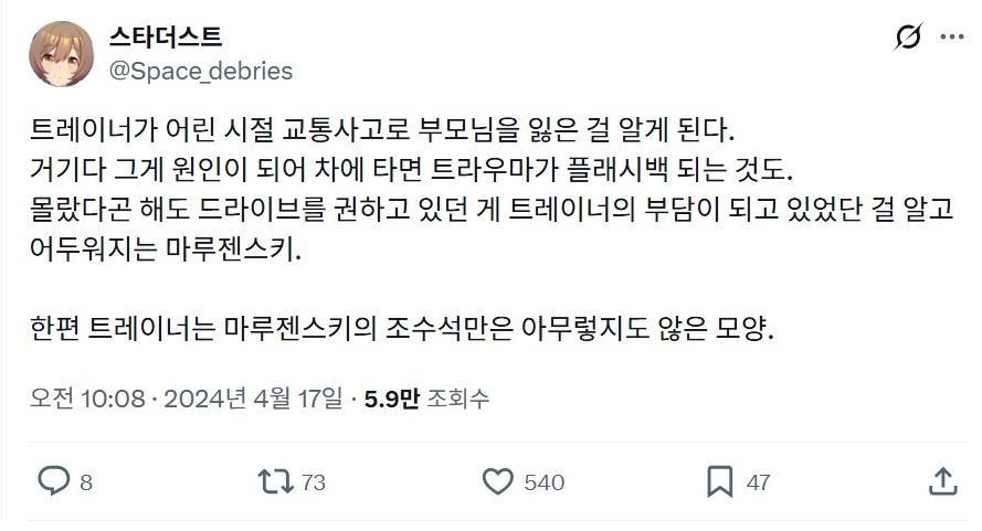 | 【우마무스메 LINE풍】 하이드라의 장난감 상자입니다. 이번에는 스타더스트 씨(@Space_debries)의 트윗이 소재인 이야기. '트라우마 시리즈'라고 할까요. 작중에서 고인이 되신 분이 계시기 때문에 다소 읽기 힘든 부분(특히 3장)이 있습니다만, 괜찮으신 분만 감상해 주십시오. 그러면 부디 "나만의 특등석" - ハイドラの玩具箱, 2024년 04월 23일 게재 - 출처: https://x.com/hydelanderbox/status/1782546611765391562 |