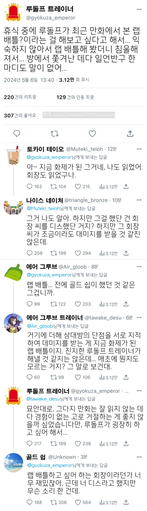 | 【우마무스메 Twitter풍】 하이드라의 장난감 상자입니다. 최근 화제가 되고 있죠 극주부도. 그 랩 배틀을 우마무스메가 하면 어떻게 되려나...라는 이야기를 아래 트윗을 보고 떠올려 써 본 게 이겁니다. 그러면 부디. "디스 랩 프리스타일" - ハイドラの玩具箱, 2024년 05월 06일 게재 - 출처: https://x.com/hydelanderbox/status/1787367168260358610 |