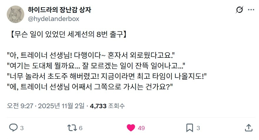 | 【무슨 일이 있었던 세계선의 8번 출구】 - ハイドラの玩具箱, 2025년 11월 02일 게재 - 출처: https://x.com/hydelanderbox/status/1984779320968298982 |