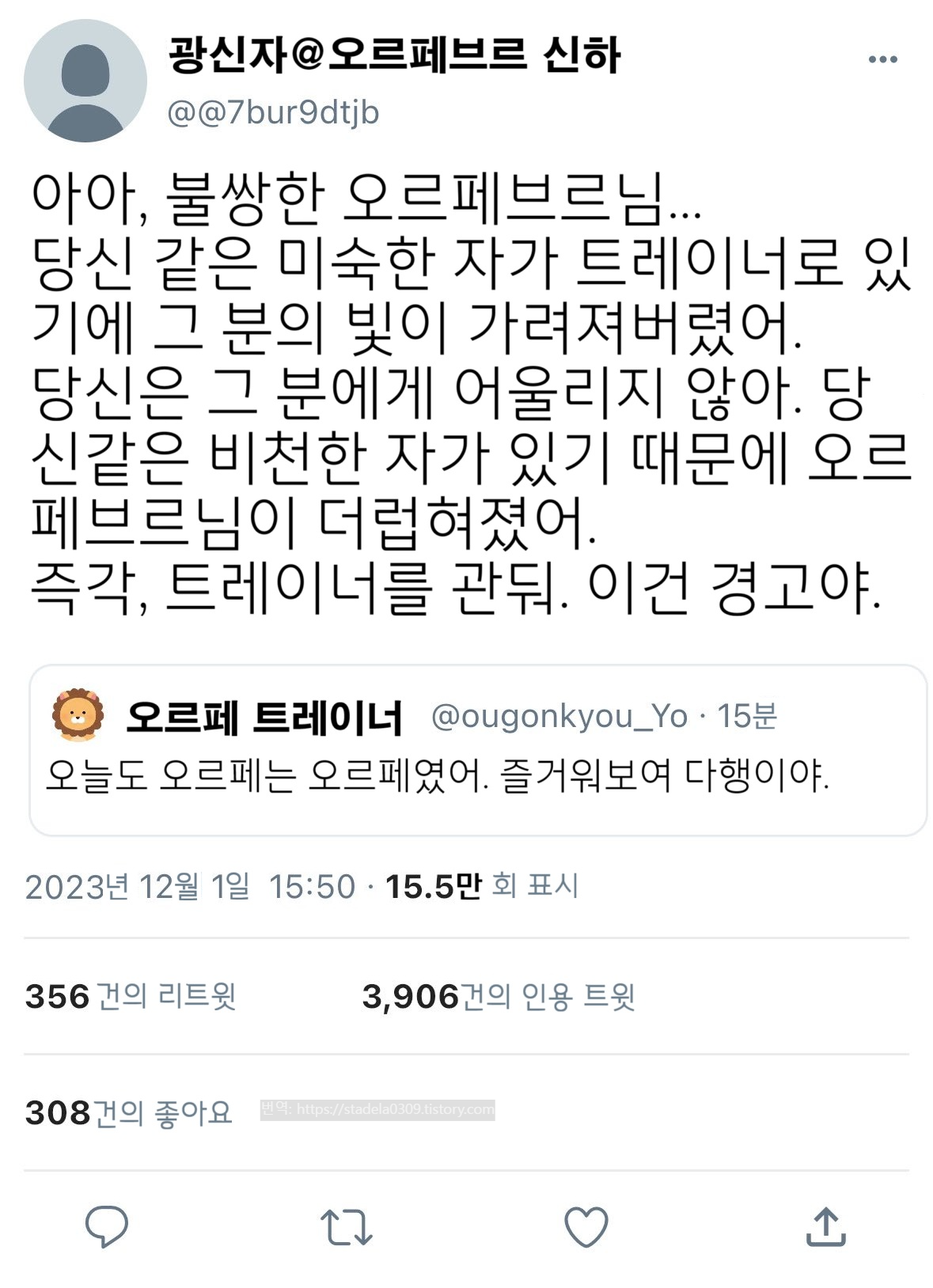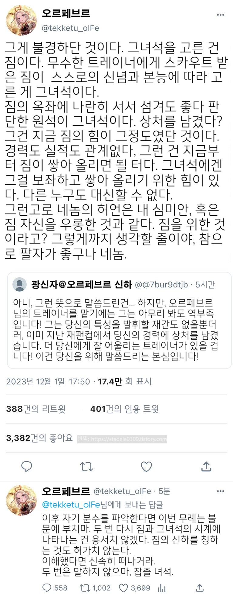 | 【우마무스메 LINE・Twitter풍】 하이드라의 장난감 상자입니다. 운동선수이기도 한 우마무스메에게는 안티도 있다고 생각합니다. 물론, 그 트레이너에게도. 그런 안티에게 어떤 대응을 보여줄 것인가라는 안티 시리즈, 선봉은 설마한 오르페입니다. 그러면 부디 "폭군의 역린" - ハイドラの玩具箱, 2024년 06월 04일 게재 - 출처: https://x.com/hydelanderbox/status/1797866023301030359 |