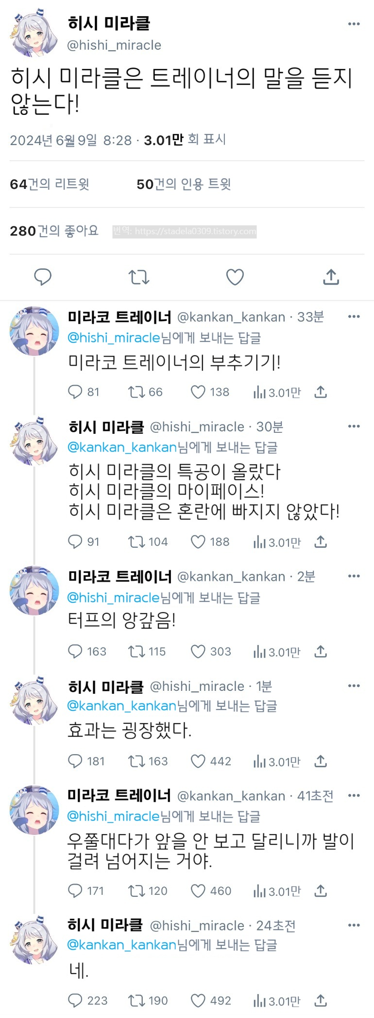 | 【우마무스메 Twitter풍】 하이드라의 장난감 상자입니다. 포켓몬 드립을 보고 갑자기 떠오른 녀석. 출주는 늘 친숙한 히시 미라클입니다. 쓰면서 생각한 건, 포켓몬도 기술이 늘었구나 라는 것입니다. 그러면 부디 "땡땡이 치지 마 히시 미라클" - ハイドラの玩具箱, 2024년 06월 15일 게재 - 출처: https://x.com/hydelanderbox/status/1801857172017660347 |