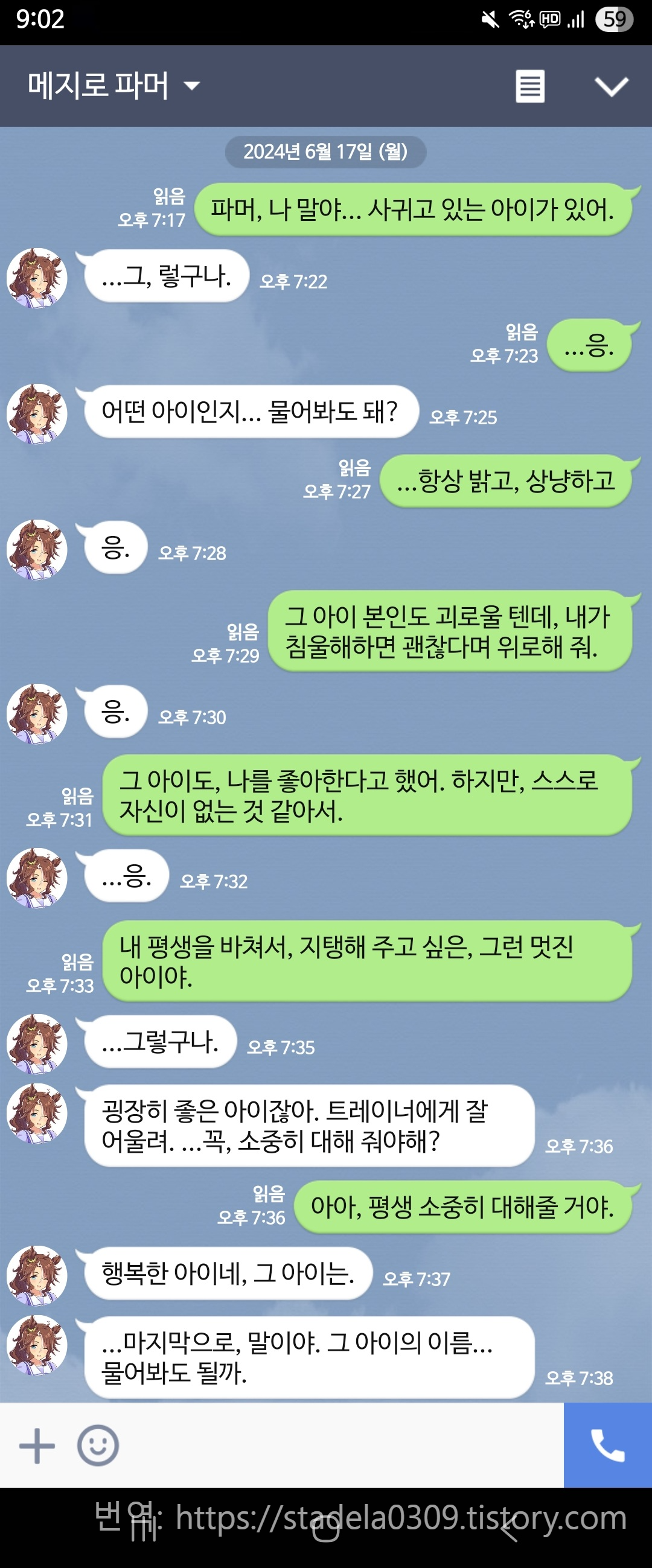 | 【우마무스메 LINE풍】 하이드라의 장난감 상자입니다. 조금 시간이 걸리긴 했지만, 문득 떠오른 상황입니다. 이번에는 파머와 미라코. 졸업 후라던가, 아무튼 언젠가 이런 식으로 대화를 주고받았으면 좋겠네... 라는 산물입니다. 괜찮다면 즐겨주십시오. 그러면 부디 "패자에게 걸맞은 엔딩" - ハイドラの玩具箱, 2024년 06월 17일 게재 - 출처: https://x.com/hydelanderbox/status/1802624690109743220 |