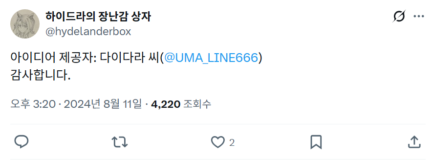 | 【우마무스메 Twitter풍】 하이드라의 장난감 상자입니다. 오래 기다리셨습니다. 여행자 씨 제3탄입니다. 이번에도 또 엄청 나사 빠져서 전신전령으로 달리고 있습니다만, 함께 해 주시길. 조~금 패러디랄까 오마주가 있으니 마음에 드시면 찾아봐 주십시오. 그러면 부디 "무언의 견제" - せきはん@脊髄反射, 2024년 08월 11일 게재 - 출처: https://x.com/hydelanderbox/status/1822513280084283487 |