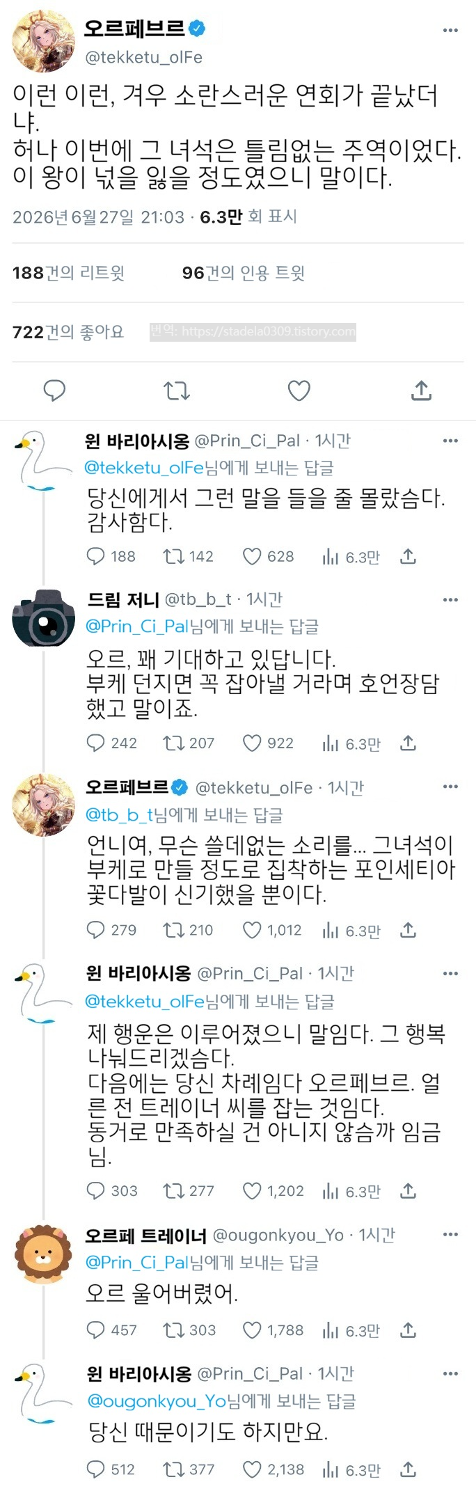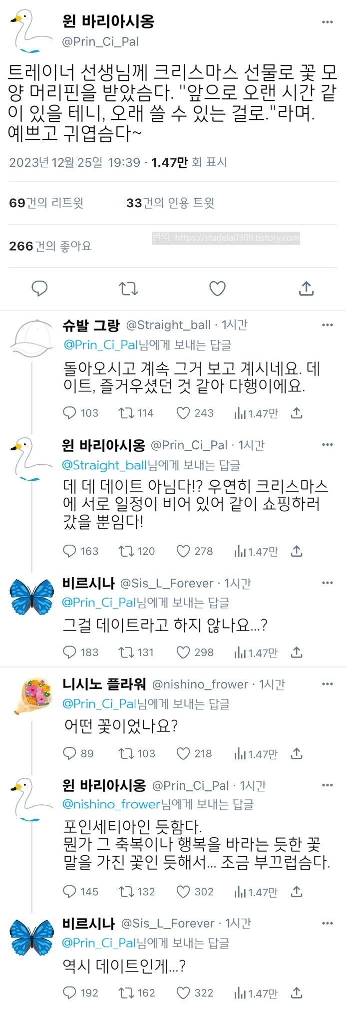 | 【우마무스메 Twitter풍】 하이드라의 장난감 상자입니다. 늦었지만 합동제 참가입니다. 달달하다고 하면 시옹이므로 시옹 씨로 출주입니다. 어떤 꽃에 축복받는 if 세계선, 즐겨주시길. 그러면 부디 「이 아름다운 주역에게 축복을」 - ハイドラの玩具箱, 2024년 12월 23일 게재 - 출처: https://x.com/hydelanderbox/status/1871156297866908019 |