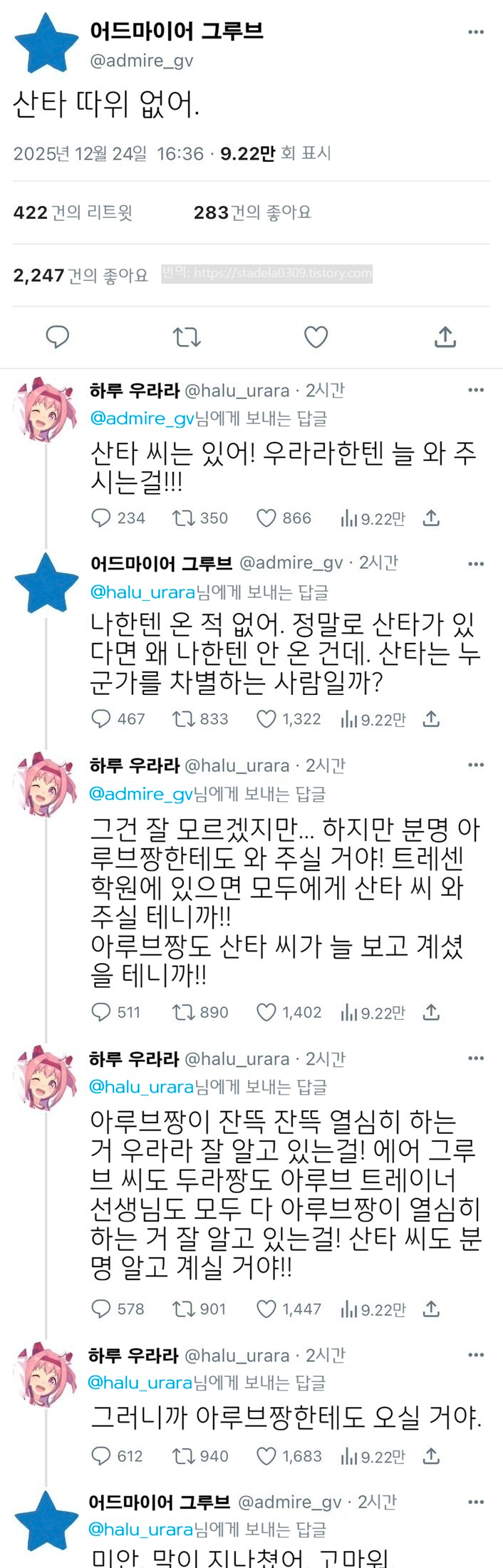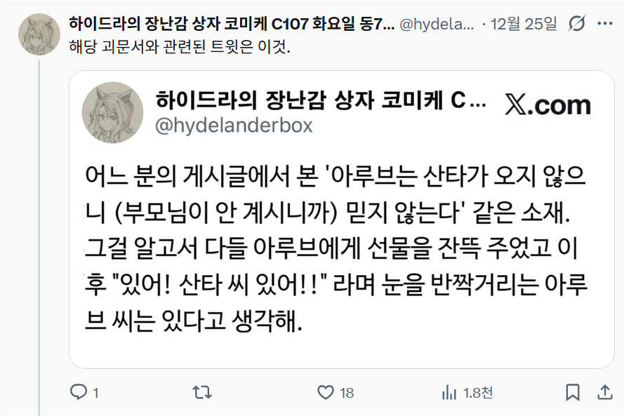 | 【우마무스메 Twitter풍】 하이드라의 장난감 상자입니다. 크리스마스네요. 여러분 어떻게 보내고 계신가요? 하이드라? 혼자서 케이크 먹으며 보내고 있을 뿐입니다만 뭐 하실 말씀이라도. 뭐 그렇게 되었으므로 아루브입니다. 해당 에피소드와 관련된 아이디어에 비해 뭔가 촉촉해져 버렸다. 그러면 부디 「크리스마스, 아루브가 눈 뜰 때쯤에는」 - ハイドラの玩具箱, 2025년 12월 25일 게재 - 출처: https://x.com/hydelanderbox/status/2004094496607510721 |