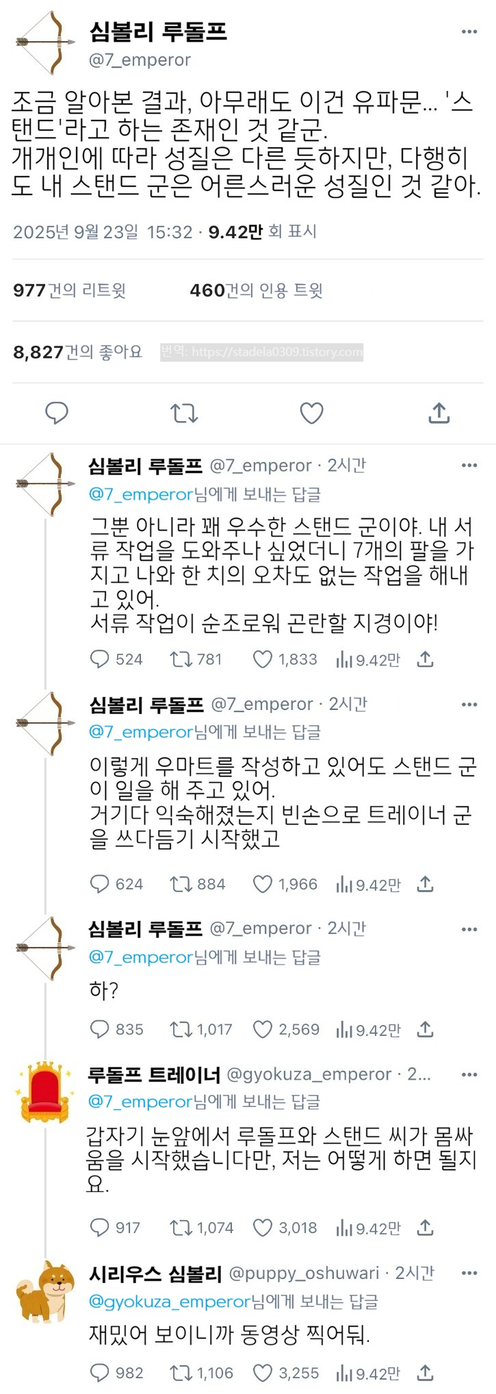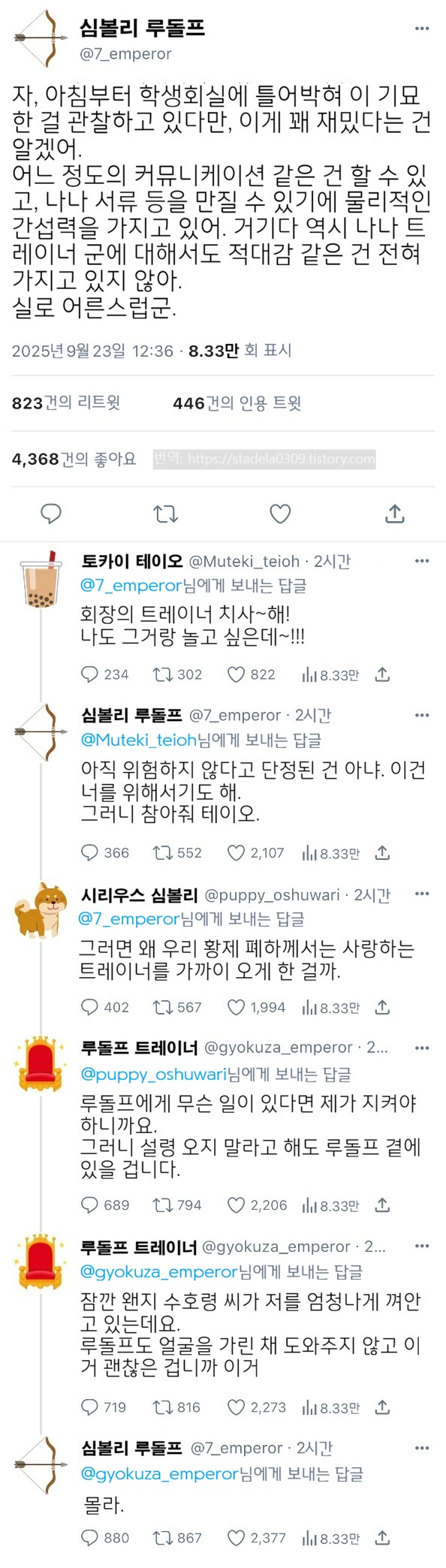 | 【우마무스메 Twitter풍】 하이드라의 장난감 상자입니다. 이번부터 죠죠 패러디 소재 편, 시동입니다. 아마 꽤 갱신이 늦어질 것 같습니다만, 기묘한 세계선으로 시작하는 '죠죠레센 학원'을 즐겨주시길. 그러면 부디 「우마무스메의 기묘한 체험담」 - ハイドラの玩具箱, 2025년 09월 24일 게재 - 출처: https://x.com/hydelanderbox/status/1970729914031915483 |