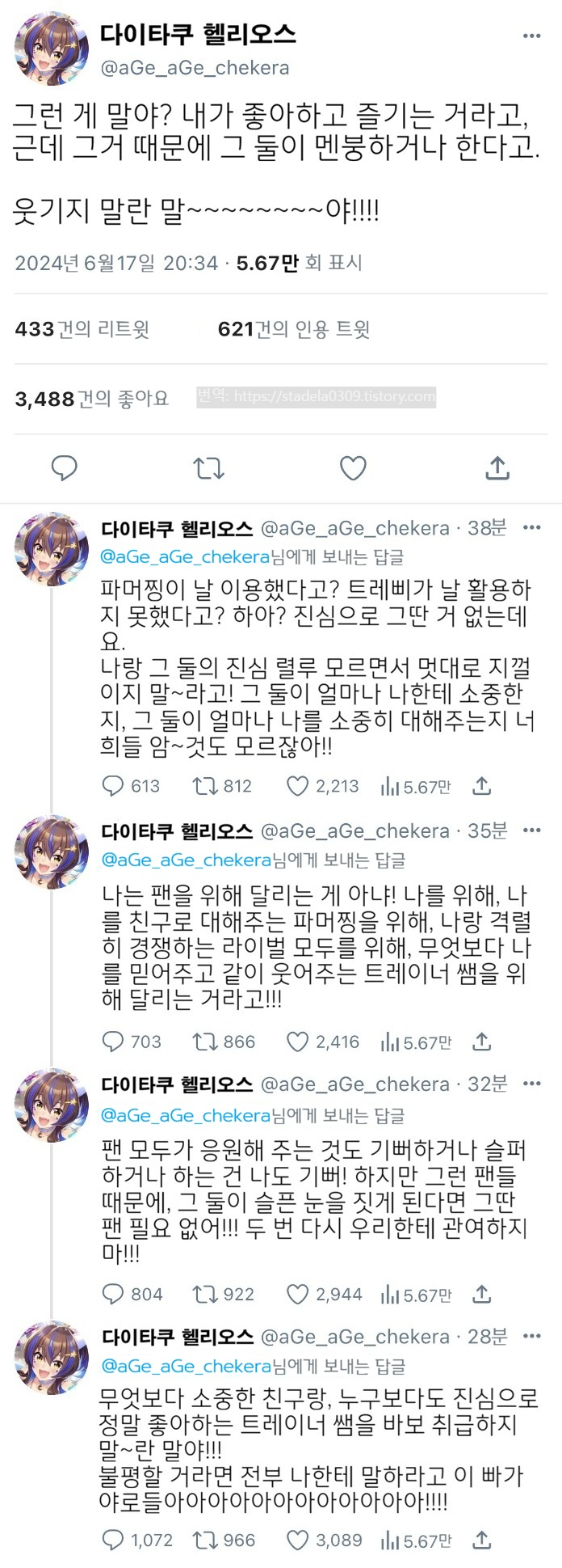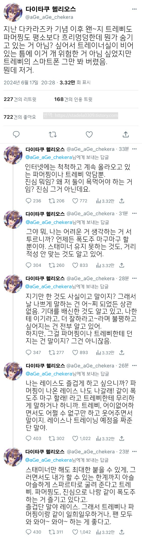 | 5번째. 이번에는 파머와 헬리오스가 같은 담당 트레이너라는 설정 쪽이 재밌을 것 같다는 덤. - ハイドラの玩具箱, 2024년 08월 26일 게재 - 출처: https://x.com/hydelanderbox/status/1827965470907175127 |