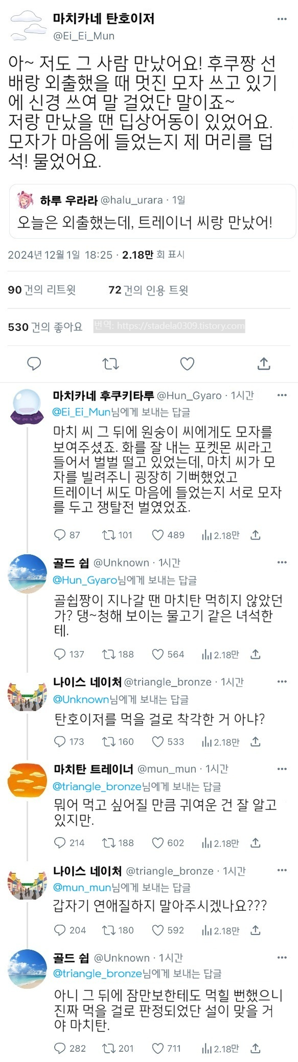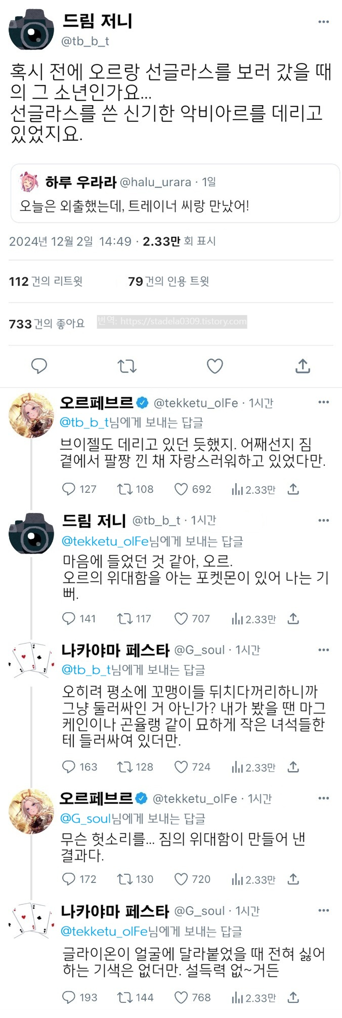 | 【우마무스메 Twitter풍】 하이드라의 장난감 상자입니다. 오랜만에 포켓몬 괴문서를. 지금도 피카츄와 함께 어디선가 여행을 계속하고 있을 그 소년, 지금은 어딜 여행하고 있는 걸까요. 의외로 트레센 학원 근처를 지나갔다던가... 그러면 부디 「Let's go 새로운 우리 세계로」 - ハイドラの玩具箱, 2024년 12월 03일 게재 - 출처: https://x.com/hydelanderbox/status/1863825497702150604 |
