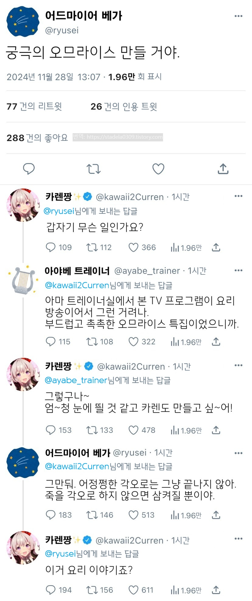 | 【우마무스메 Twitter풍】 하이드라의 장난감 상자입니다. 이번에는 리퀘스트 작품, '오므라이스를 만드는 아야베 씨'. 촉촉하고 폭신한 오므라이스는 맛있죠. 그리고 아야베 씨가 만드는 거라면 타협하는 미래 따위 보이지 않는군요. 그래서, 이렇게 되었습니다. 5장 구성입니다. 그러면 부디 「AYABE's 키친」 - ハイドラの玩具箱, 2024년 12월 05일 게재 - 출처: https://x.com/hydelanderbox/status/1864550272363565072 |