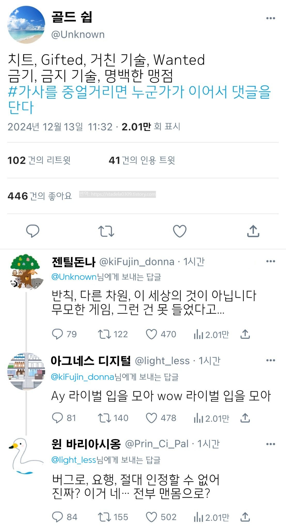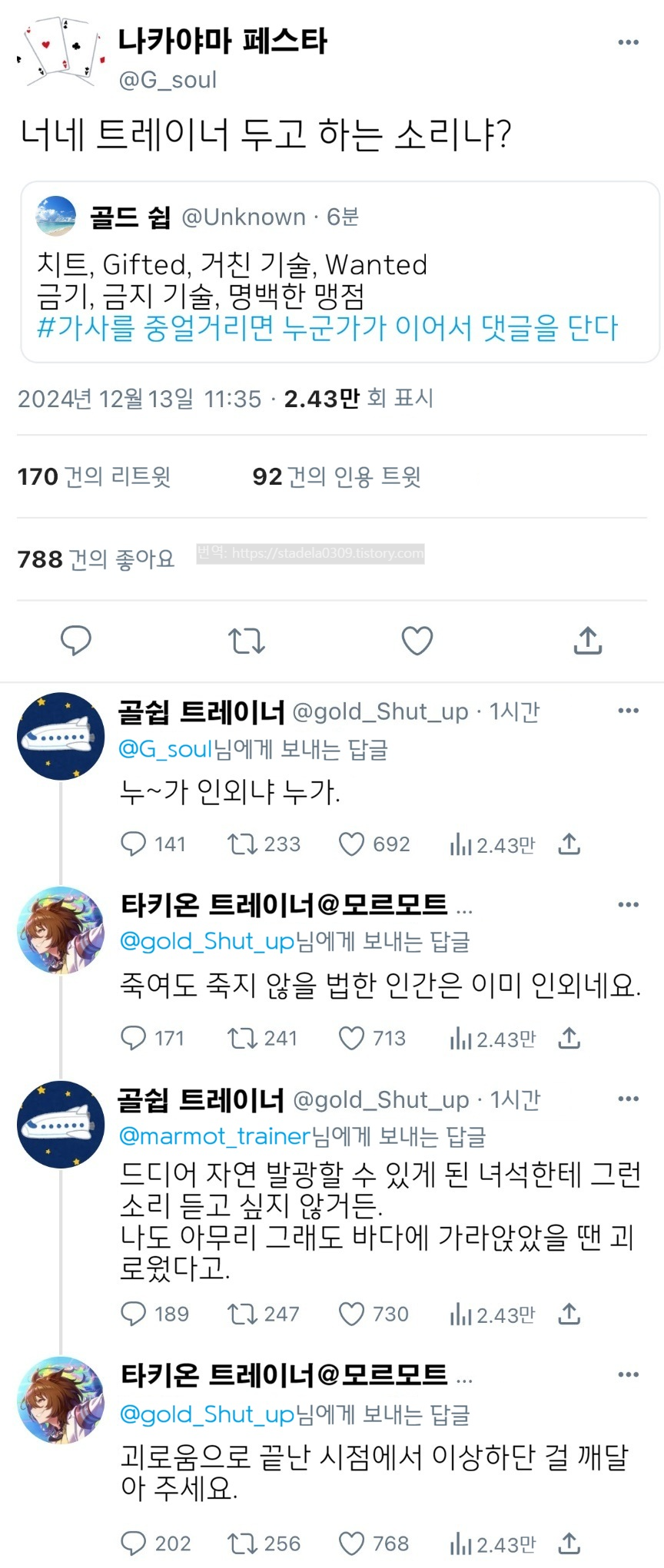 | 【우마무스메 Twitter풍】 하이드라의 장난감 상자입니다. 이번에는 가사 잇기 괴문서. 노래 즐겁단 말이죠, Creepy Nuts. 지금은 제 단골 레퍼토리 중 하나가 되었습니다. 그러면 부디 「'윽'하게 되는 펀치 병문안임다」 - ハイドラの玩具箱, 2024년 12월 13일 게재 - 출처: https://x.com/hydelanderbox/status/1867449371174084763 |