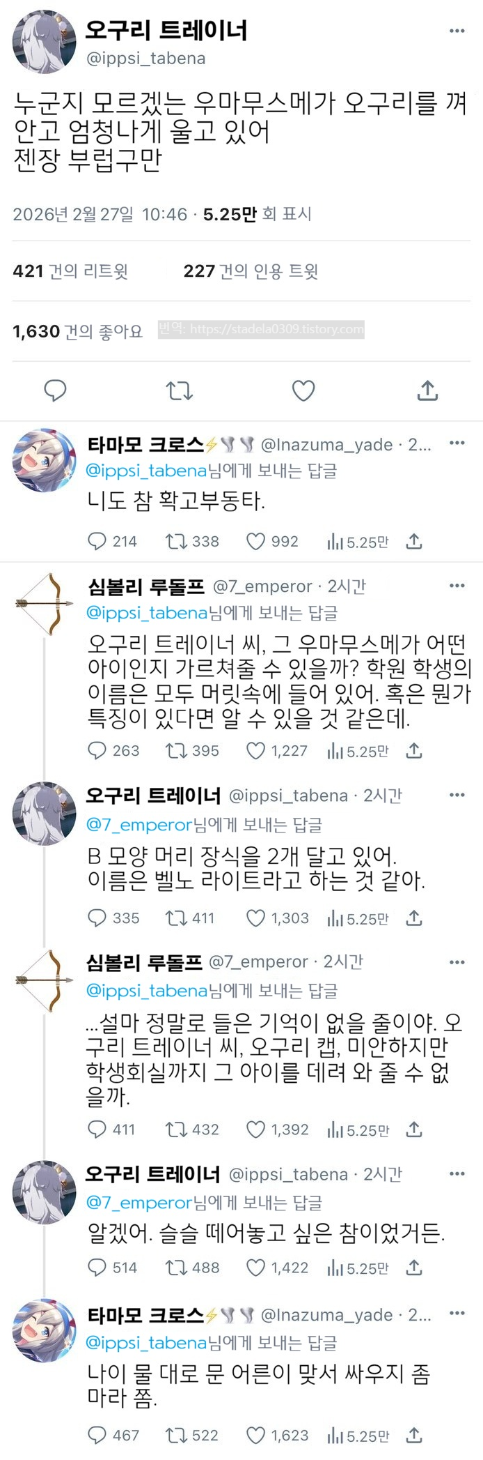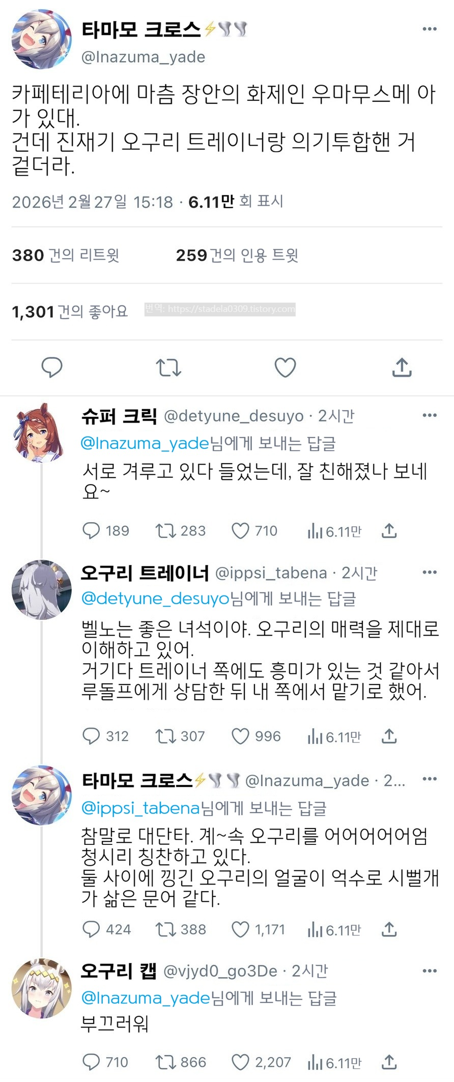 | 【우마무스메 Twitter풍】 하이드라의 장난감 상자입니다. 오래 기다리셨습니다, 이세계 벨노 시리즈입니다. 힘내서 계속 써보고 싶습니다. 이번에는 도입부가 강하니 양해해 주시길. 그러면 부디 「벨노, 이쪽 세계의 트레센에 온 듯하다」 - ハイドラの玩具箱, 2026년 03월 05일 게재 - 출처: https://x.com/hydelanderbox/status/2029436787425460578 |