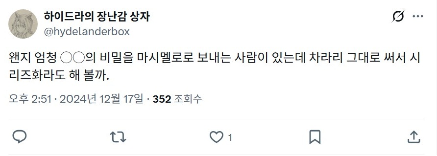 ※ 이 작품은 ハイドラの玩具箱님(@hydelanderbox)의 허가를 받고 번역되었습니다.