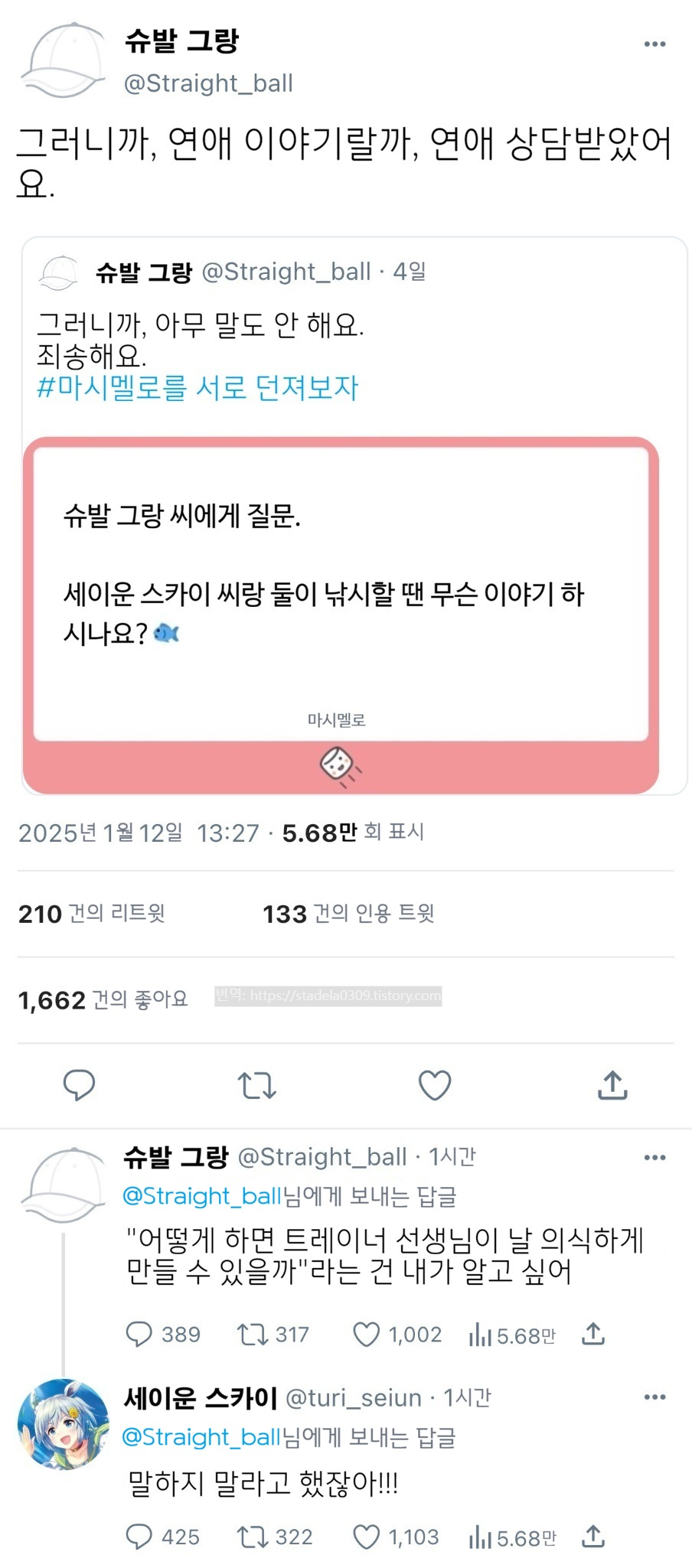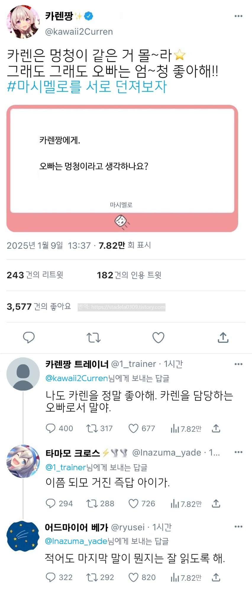 | 【우마무스메 Twitter풍】 하이드라의 장난감 상자입니다. 전에 말씀드린 마시멜로 시리즈의 시동을 걸어봤습니다. 선두를 끊는 건 카렌짱과 슈바치. 호평이라면 이런 걸 물어보고 싶다는 마시멜로나 mond를 부디 하이드라에게 보내주시길. 피눈물 흘리면서 쓰겠습니다.() 그러면 부디 「트레센 학원 마시멜로부 ①」 - ハイドラの玩具箱, 2025년 01월 10일 게재 - 출처: https://x.com/hydelanderbox/status/1877596237928566984 |