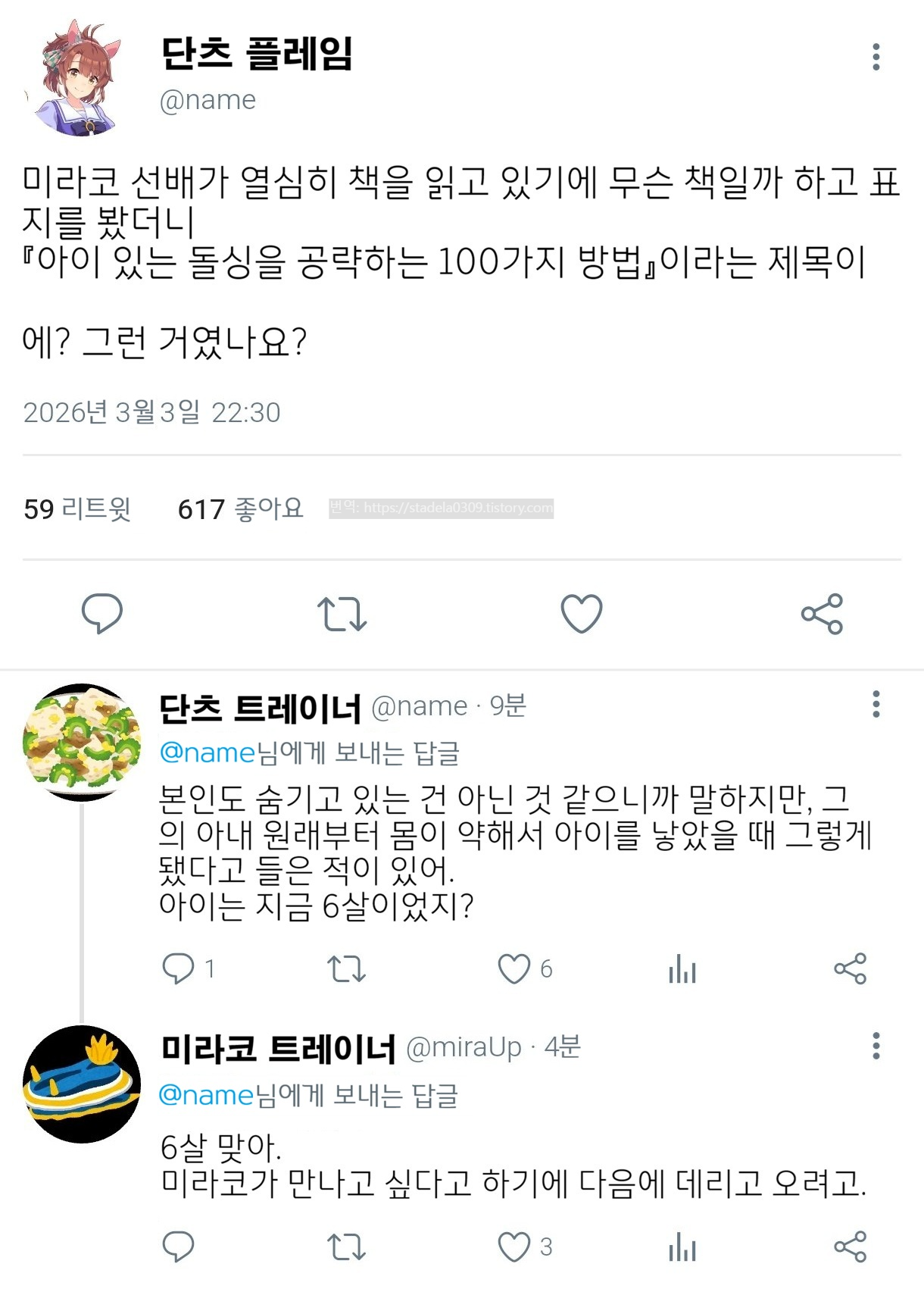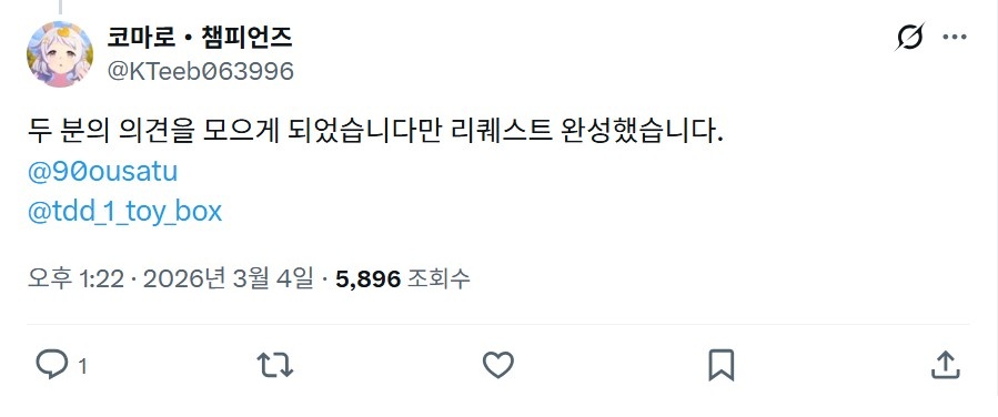 | 【트레이너 100명에게 물어봤다! 당신의 이상형은? Part 2】 오토나시 "그렇다면 한 마디로! 이상형이 어떻게 되시죠?" 돈나 트레이너 "섬세하고 연약해서 지키고 싶어지는 그런 분이려나요." 리퀘스트에 의한 설마 하던 제2탄입니다. - 寝炬燵こまろ@ウマ娘ライン風, 2026년 03월 04일 게재 - 출처: https://x.com/KTeeb063996/status/2029049695574917406 |