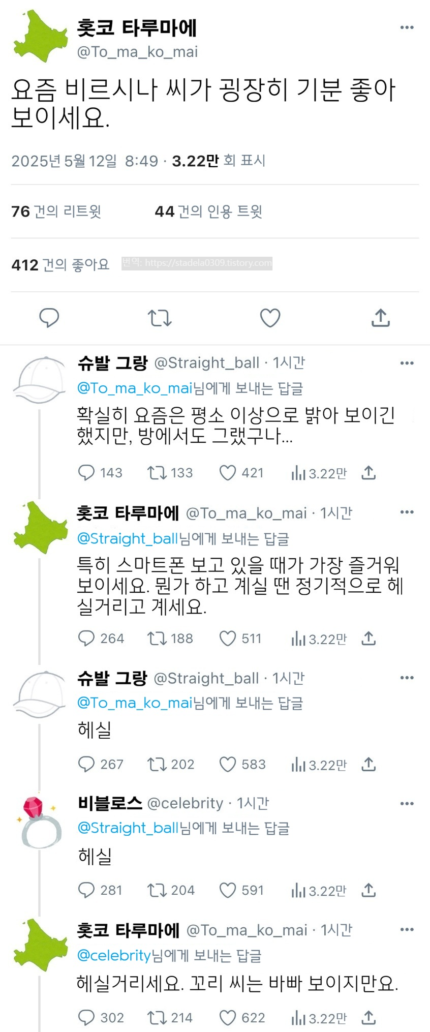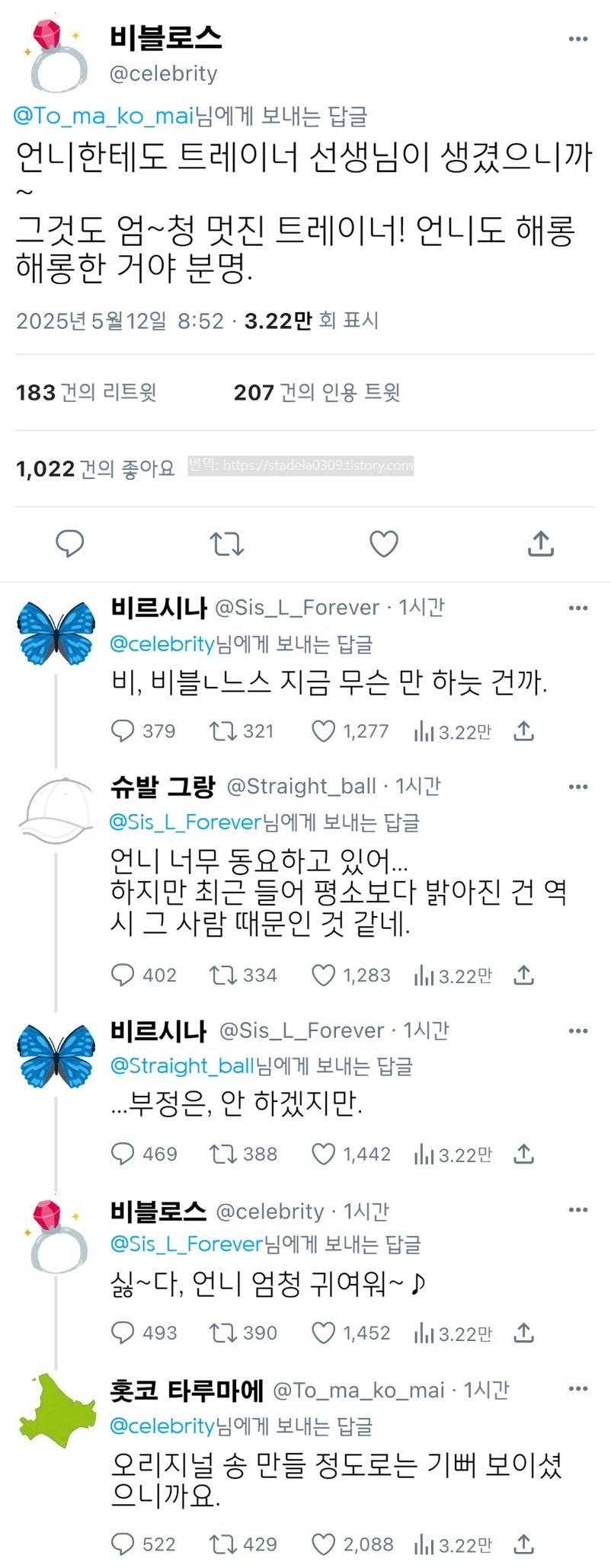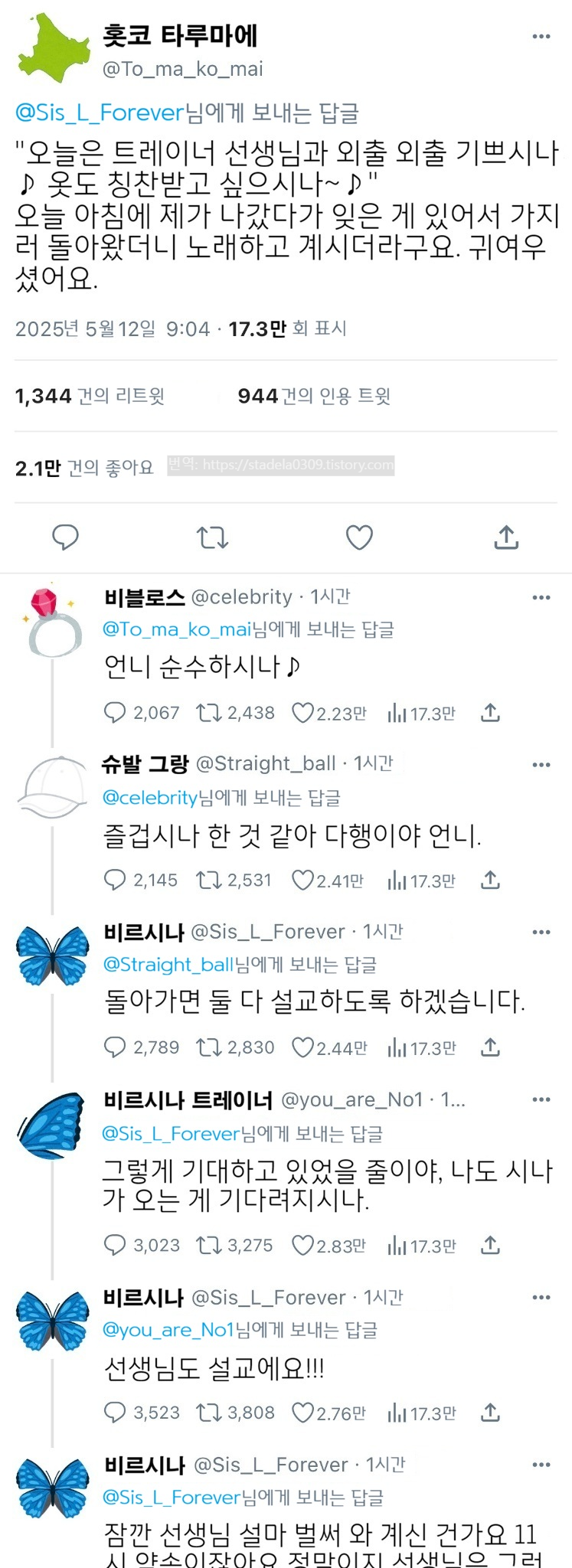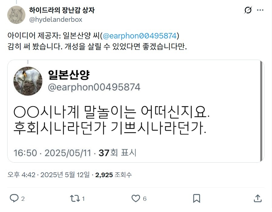 | 【우마무스메 Twitter풍】 하이드라의 장난감 상자입니다. 드디어 언니 실장이군요. 기다렸습니다, 정말 엄청. 그렇게 되었으니 제물 겸 시나 씨 괴문서를 한 편. 새로운 트레이너 탄생의 순간을 목격하시라. 그러면 부디 「비르시나 애호」 - ハイドラの玩具箱, 2025년 05월 12일 게재 - 출처: https://x.com/hydelanderbox/status/1921807552977002582 |