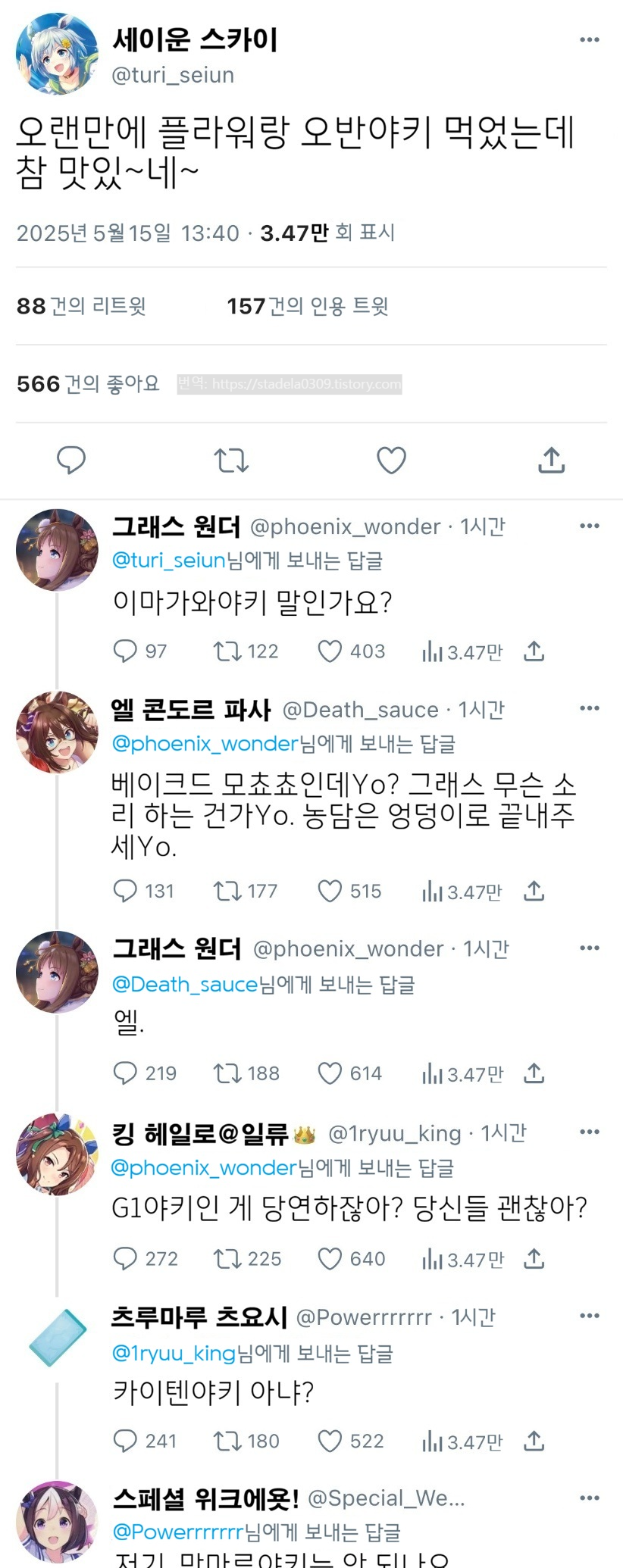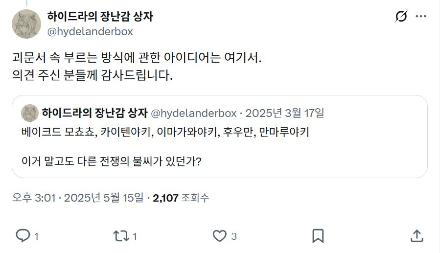| 【우마무스메 Twitter풍】 하이드라의 장난감 상자입니다. 갑작스럽지만 후우만 엄청 맛있단 말이죠. 에? 뭔지 모른다고? 오반야키? 이마가와야키? ...과연, 네놈 '적'이구나? 인류가 화해할 수 없는 영원한 논쟁, 트레센 학원에서도 개막입니다. 그러면 부디 「트레센 속의 전쟁」 - ハイドラの玩具箱, 2025년 05월 15일 게재 - 출처: https://x.com/hydelanderbox/status/1922894719589527561 |