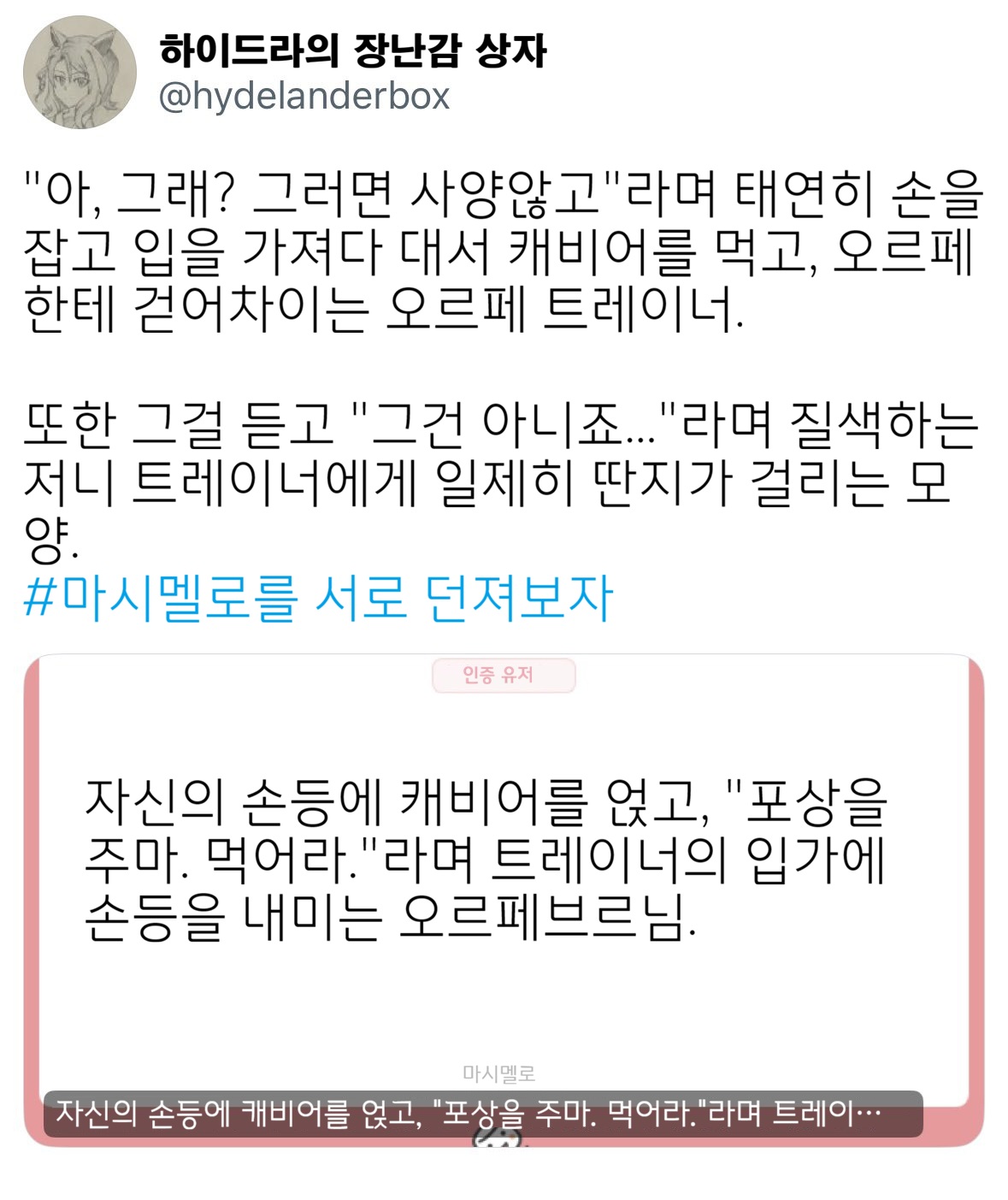 ※ 이 작품은 ハイドラの玩具箱님(@hydelanderbox)의 허가를 받고 번역되었습니다.
