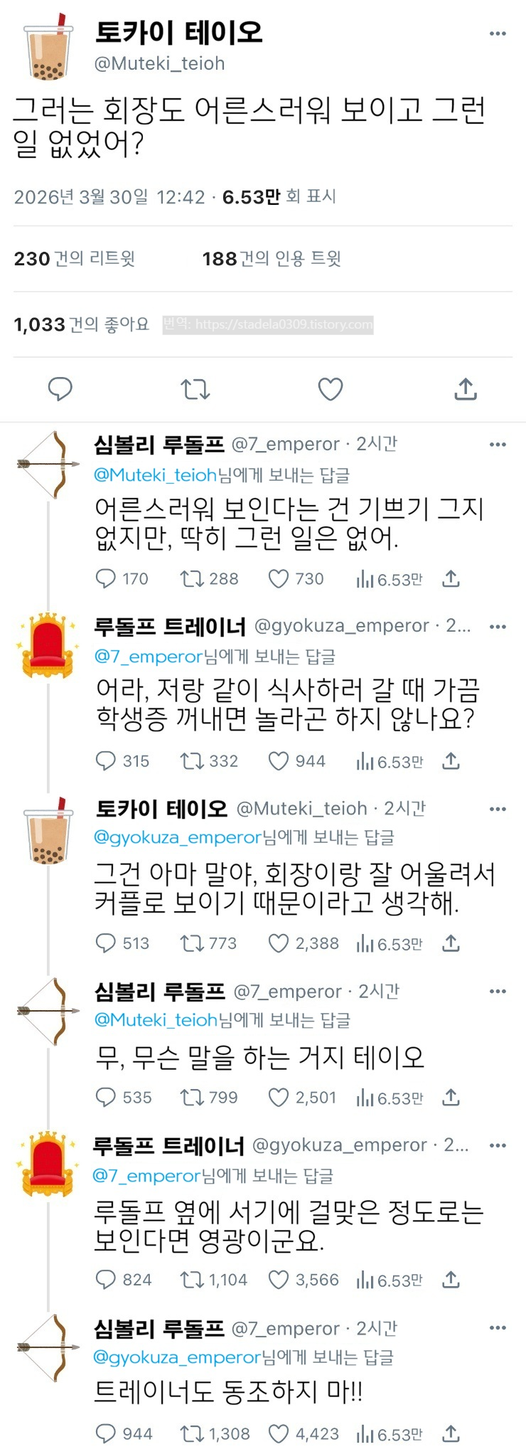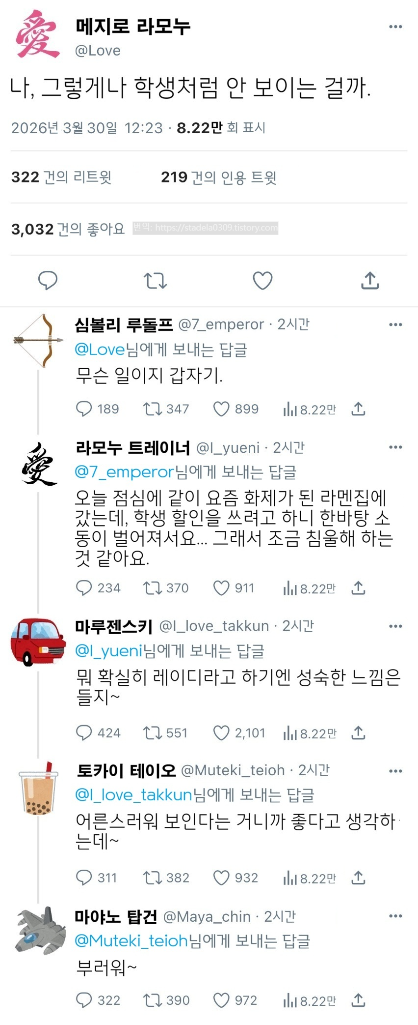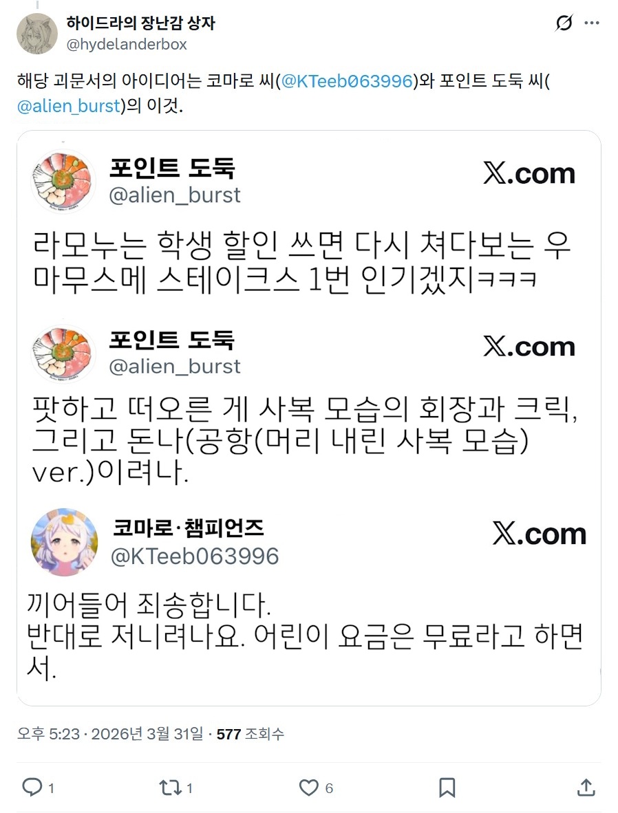 | 【우마무스메 Twitter풍】 하이드라의 장난감 상자입니다. 다른 분의 아이디어에서 계시를 받았으므로 만들어 봤습니다. 초기에 어느 분의 작품을 보고 학생 할인을 쓰려다 혼나는 라모누가 아직도 잊히지 않아요. 그러면 부디 「너 같은 학생이 어디 있어!!」 - ハイドラの玩具箱, 2026년 03월 31일 게재 - 출처: https://x.com/hydelanderbox/status/2038858836711223650 |