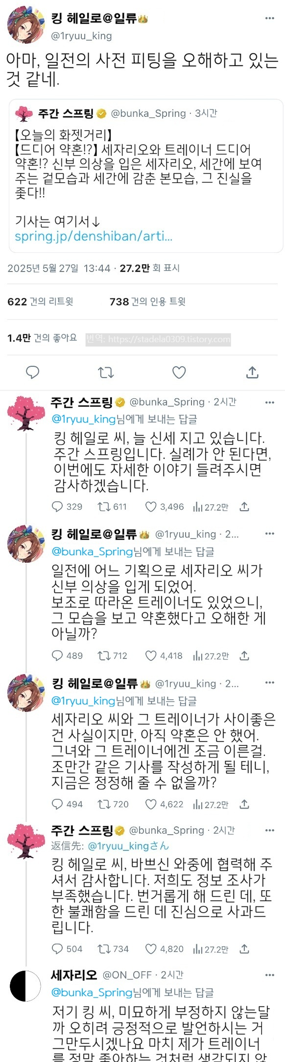 | 【우마무스메 Twitter풍】 하이드라의 장난감 상자입니다. 약속대로 신부자리오입니다. 그렇다곤 해도 입게 된 경위는 잘 모르겠는지라 둥실둥실합니다. 오랜만의 주간 스프링, 날뜁니다. 그러면 부디 「off의 신부」 - ハイドラの玩具箱, 2025년 05월 30일 게재 - 출처: https://x.com/hydelanderbox/status/1928330538861089278 |