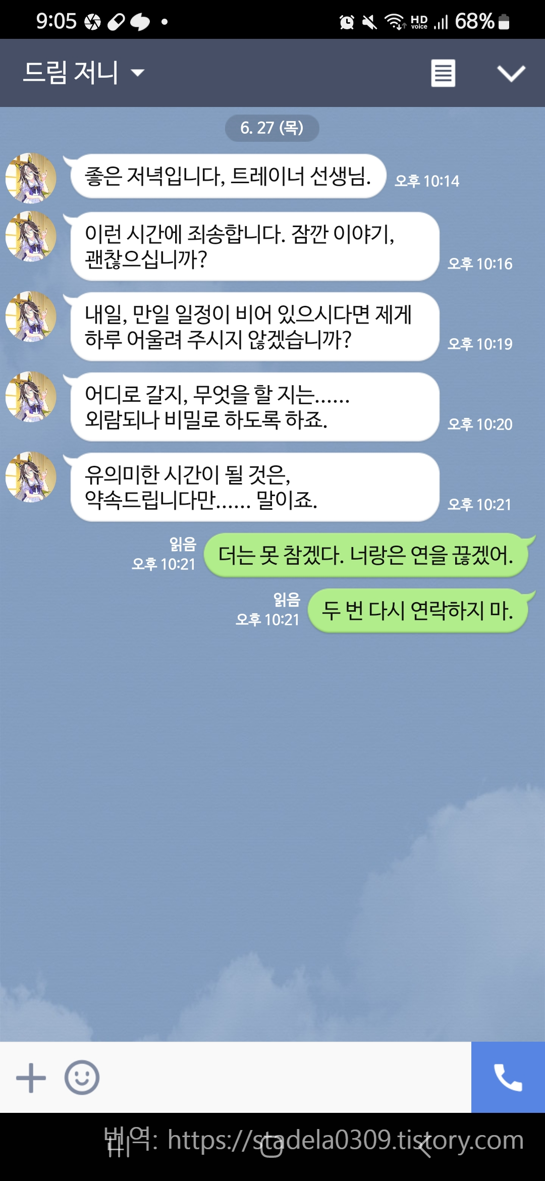 '【毎日19時投稿】だいだらぼっち@ウマ娘LINEトーク画面風怪文書 > 담당에게 잘못 보내 버렸다... (完)' 카테고리의 다른 글